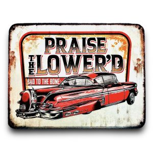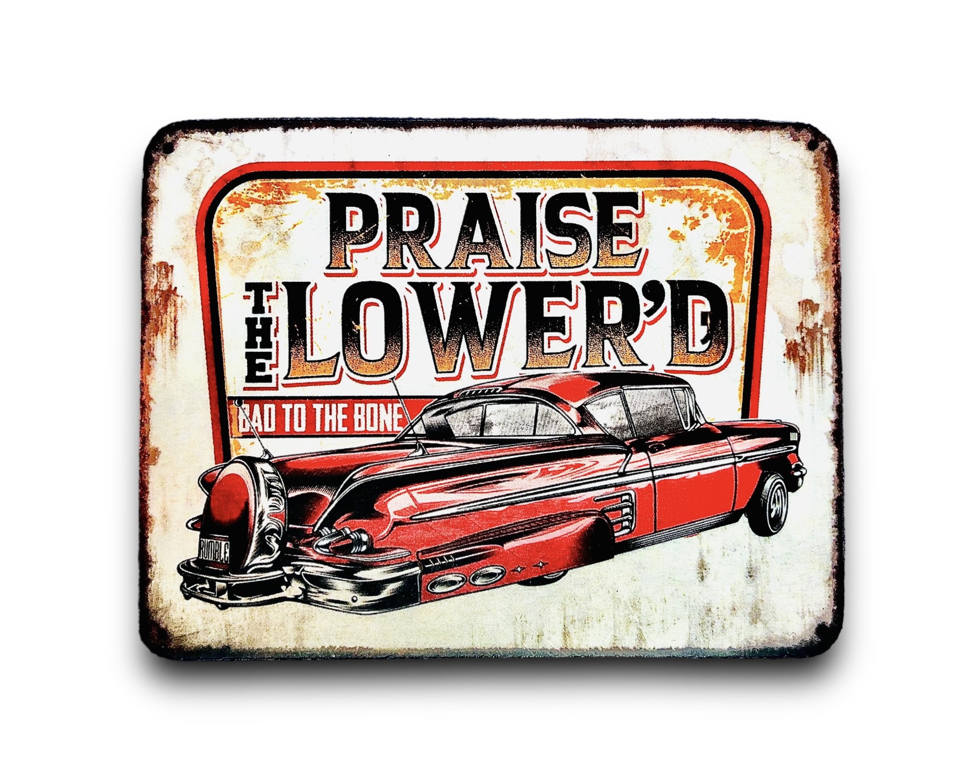 KUBEK W STYLU PRL, WYKONANY W CAŁOŚCI Z METALU Z MALUNKIEM CZERWONEGO POLONEZA