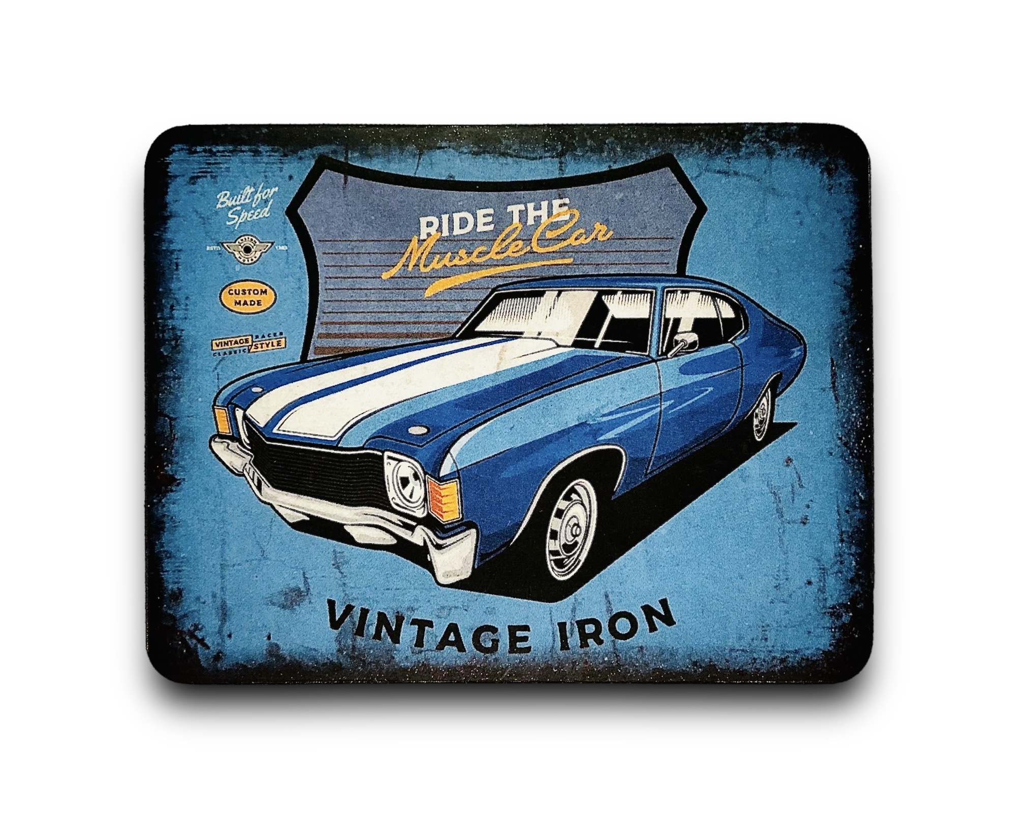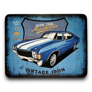 KUBEK W STYLU PRL, WYKONANY W CAŁOŚCI Z METALU Z MALUNKIEM CZERWONEGO POLONEZA