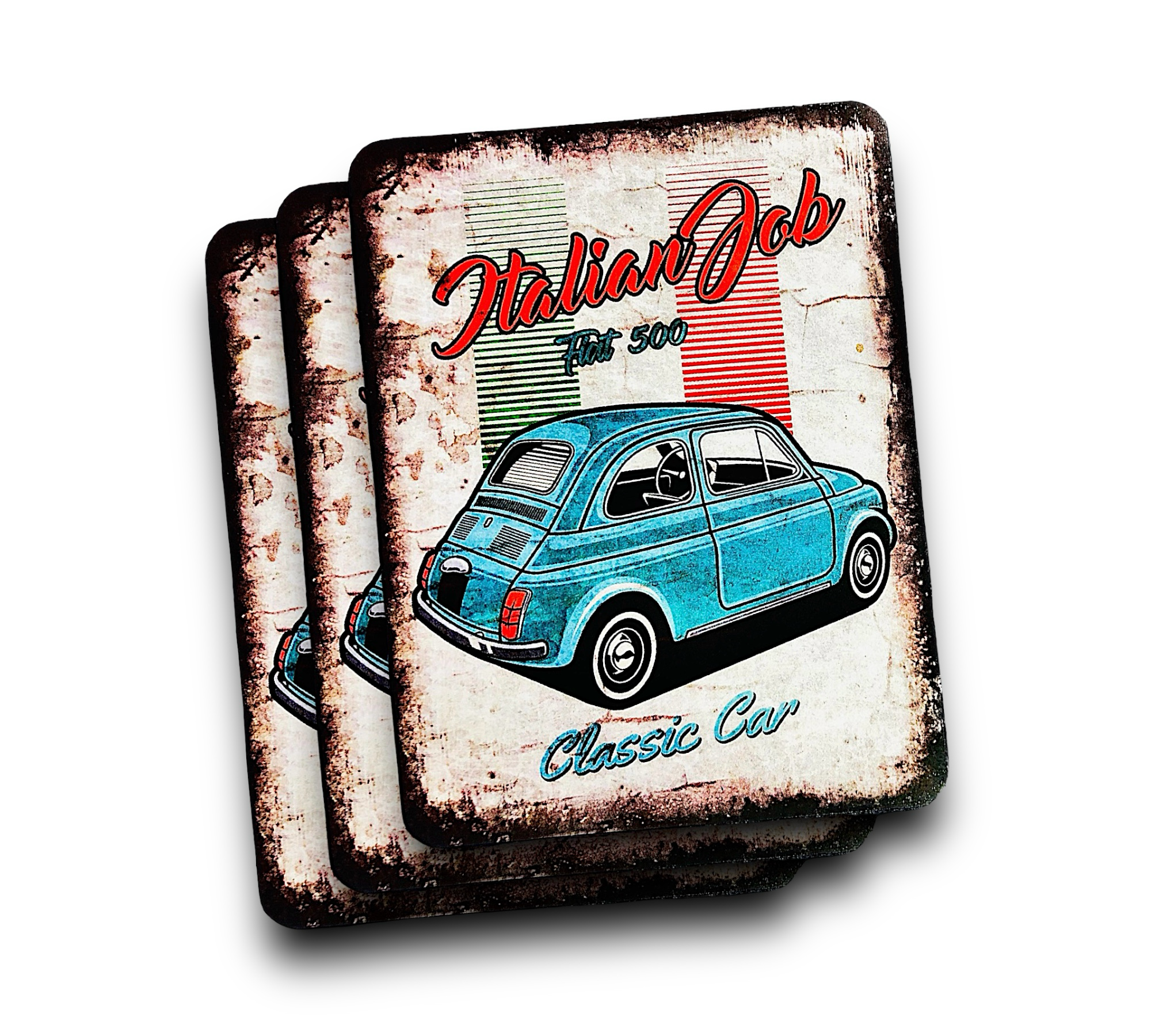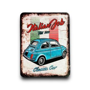 KUBEK W STYLU PRL, WYKONANY W CAŁOŚCI Z METALU Z MALUNKIEM CZERWONEGO POLONEZA