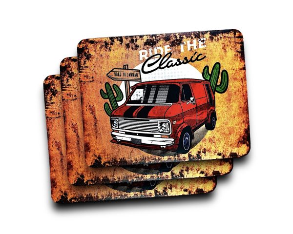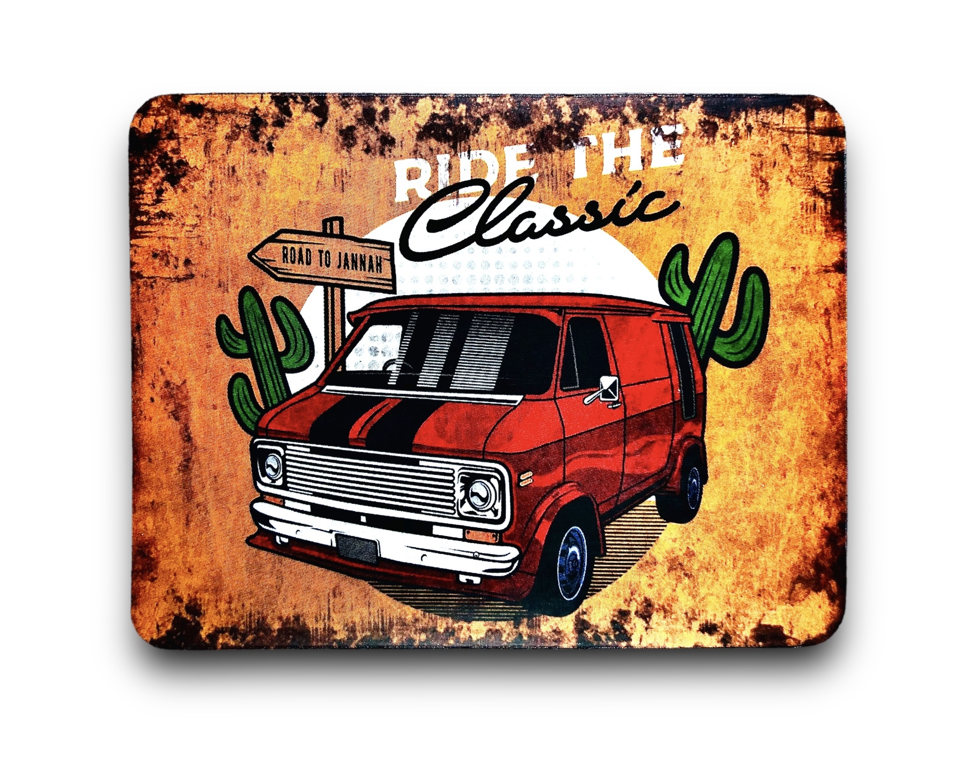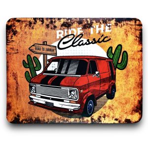 KUBEK W STYLU PRL, WYKONANY W CAŁOŚCI Z METALU Z MALUNKIEM CZERWONEGO POLONEZA