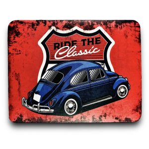 KUBEK W STYLU PRL, WYKONANY W CAŁOŚCI Z METALU Z MALUNKIEM CZERWONEGO POLONEZA