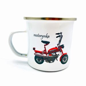 KUBEK W STYLU PRL, WYKONANY W CAŁOŚCI Z METALU Z MALUNKIEM CZERWONEJ MOTORYNKI