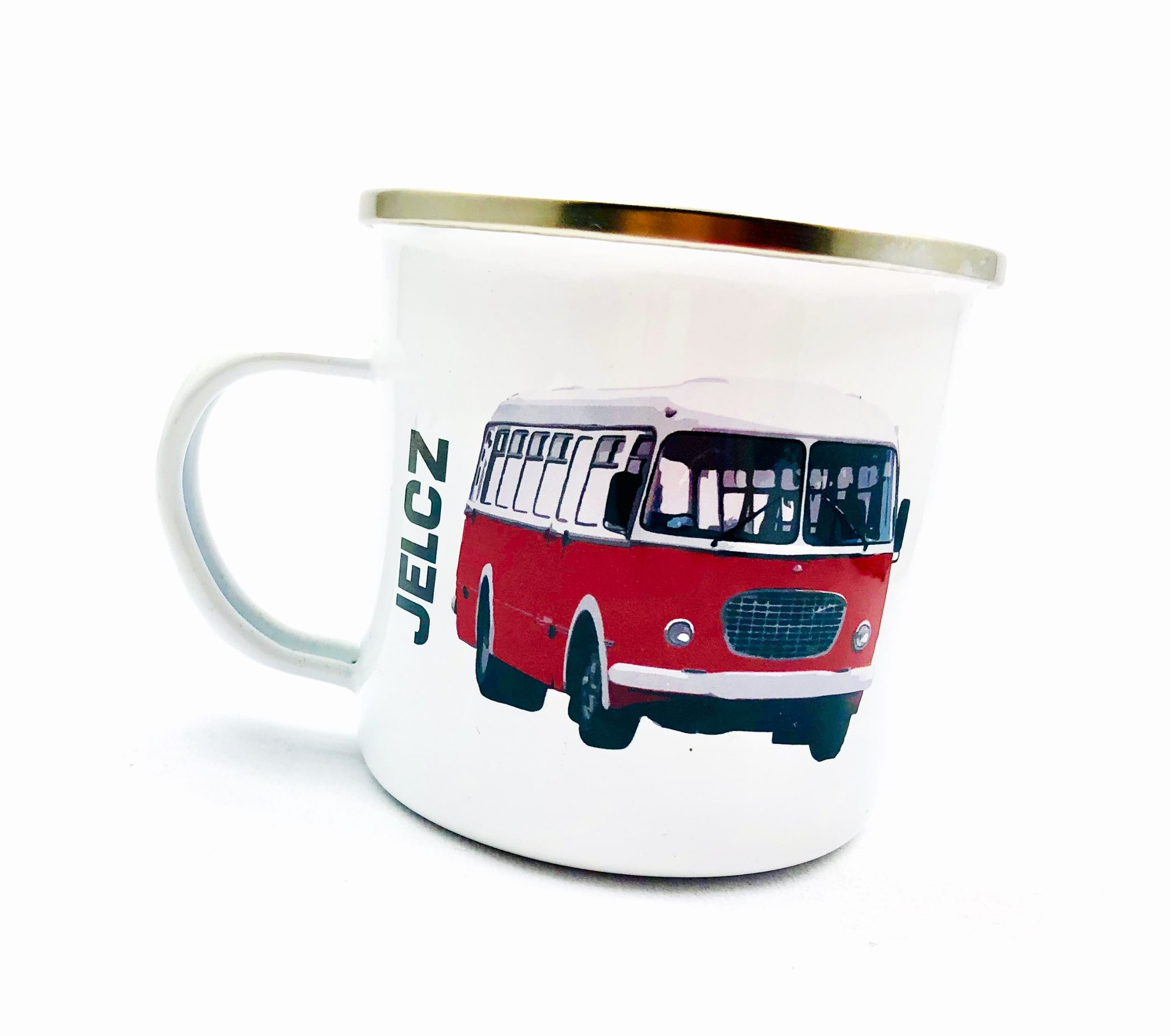 KUBEK W STYLU PRL, WYKONANY W CAŁOŚCI Z METALU Z CIEKAWYM MOTYWEM I NAPISEM "I LOVE PRL"