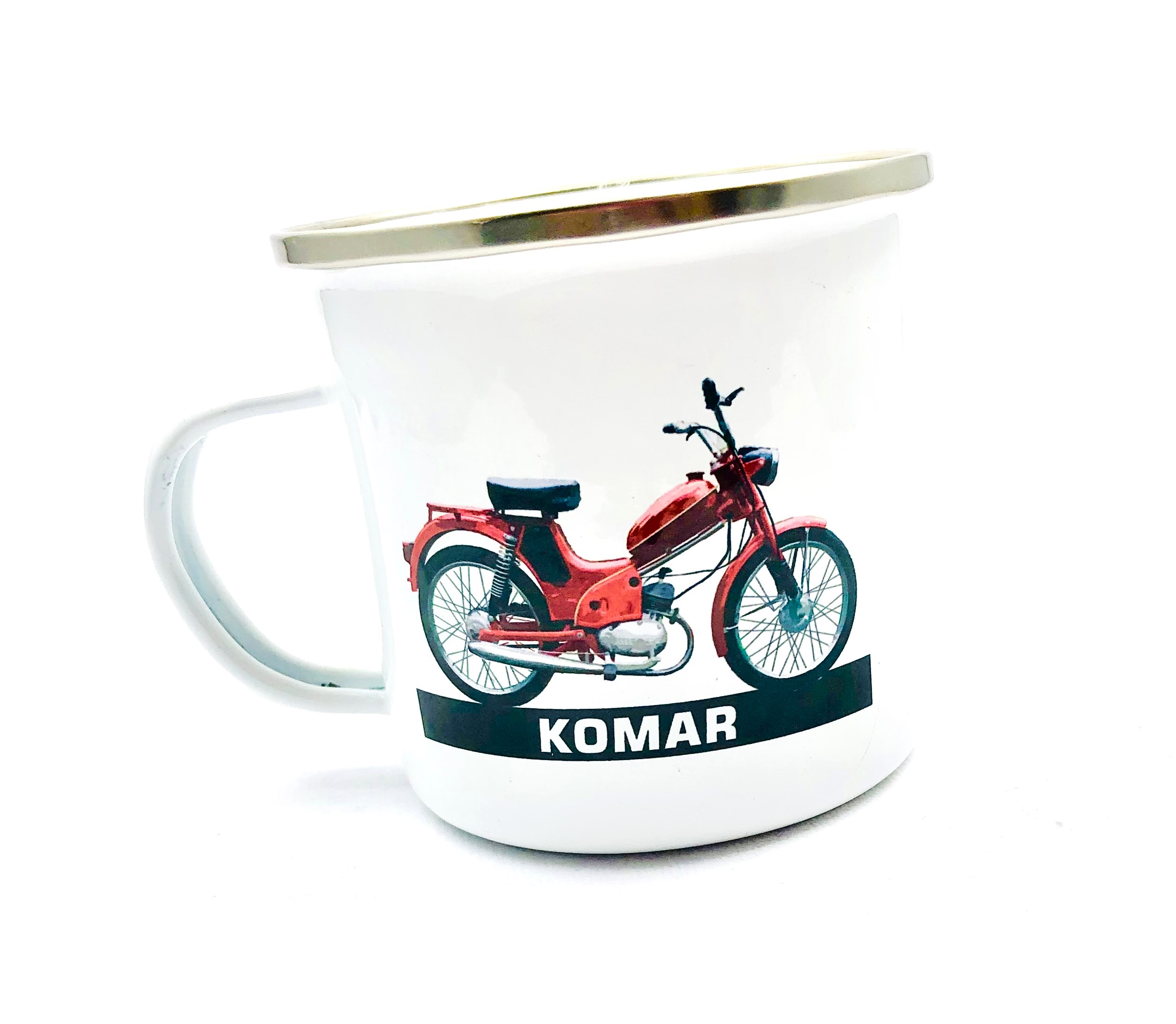 KUBEK W STYLU PRL, WYKONANY W CAŁOŚCI Z METALU Z MALUNKIEM CZERWONEGO POLONEZA