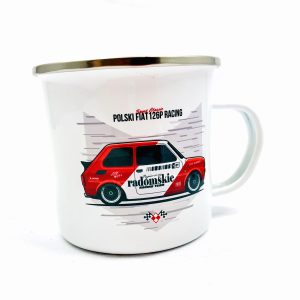 KUBEK W STYLU PRL, WYKONANY W CAŁOŚCI Z METALU Z MALUNKIEM MALUCHA W MOTYWIE "RADOMSKIE"