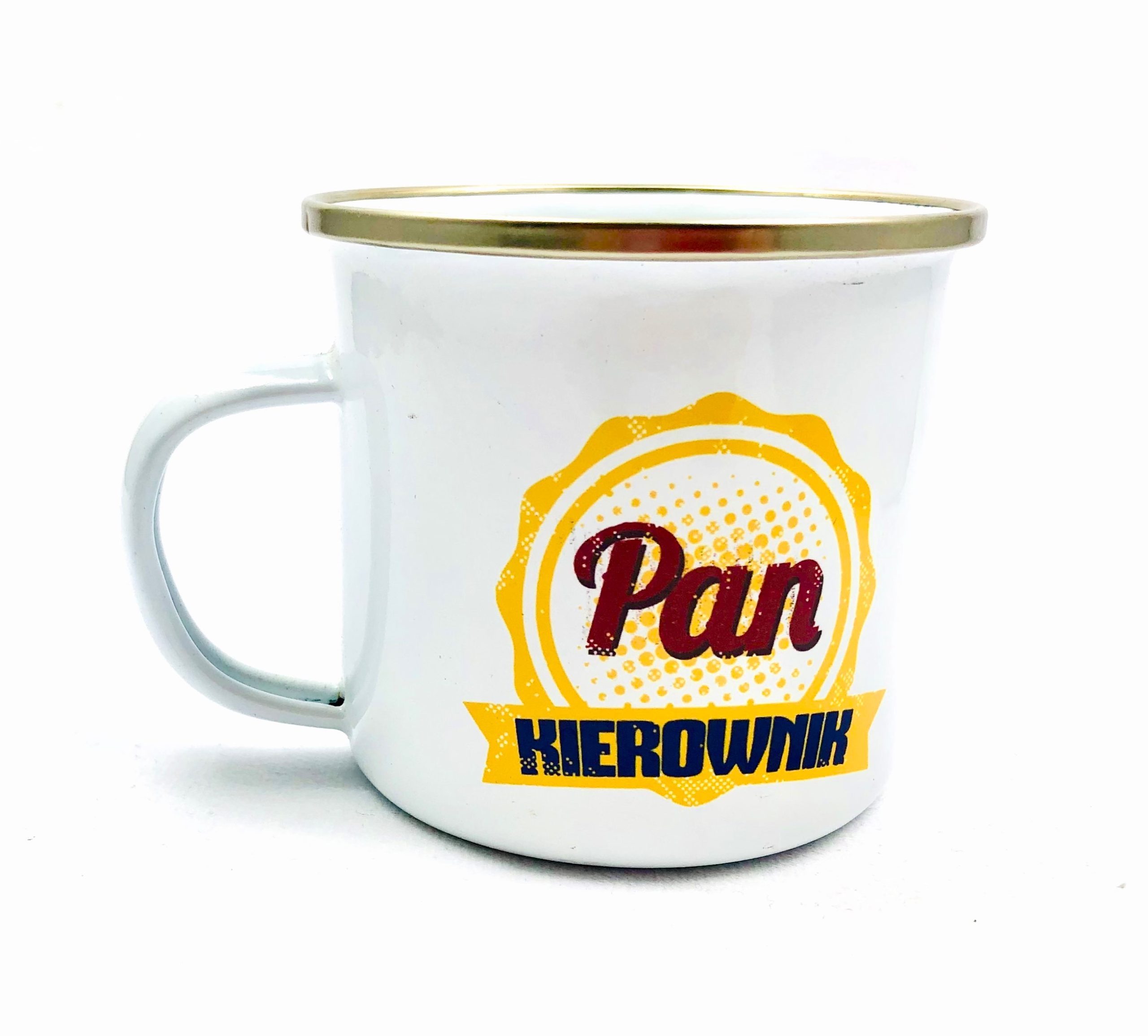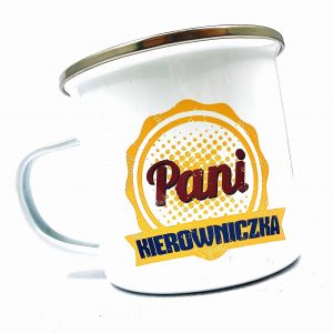 KUBEK W STYLU PRL, WYKONANY W CAŁOŚCI Z METALU Z CIEKAWYM MOTYWEM I NAPISEM "I LOVE PRL"