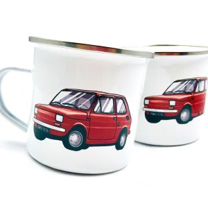 KUBEK W STYLU PRL, WYKONANY W CAŁOŚCI Z METALU Z MALUNKIEM CZERWONEGO POLONEZA