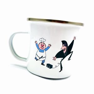 KUBEK W STYLU PRL, WYKONANY W CAŁOŚCI Z METALU Z MOTYWEM BAJKI BALTAZARA GĄBKI